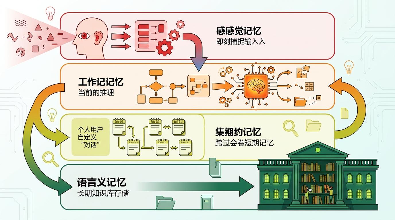 比如“忆立方”模型,它把AI的记忆分成了四层:感官记忆负责即时捕获输入,工作记忆负责当前推理,情景记忆负责跨会话的短期记忆,语义记忆负责长期存储知识库。这种分层设计解决了传统AI“记不住事”的问题——就像你大脑里的临时记事本和永久藏书阁,各司其职。