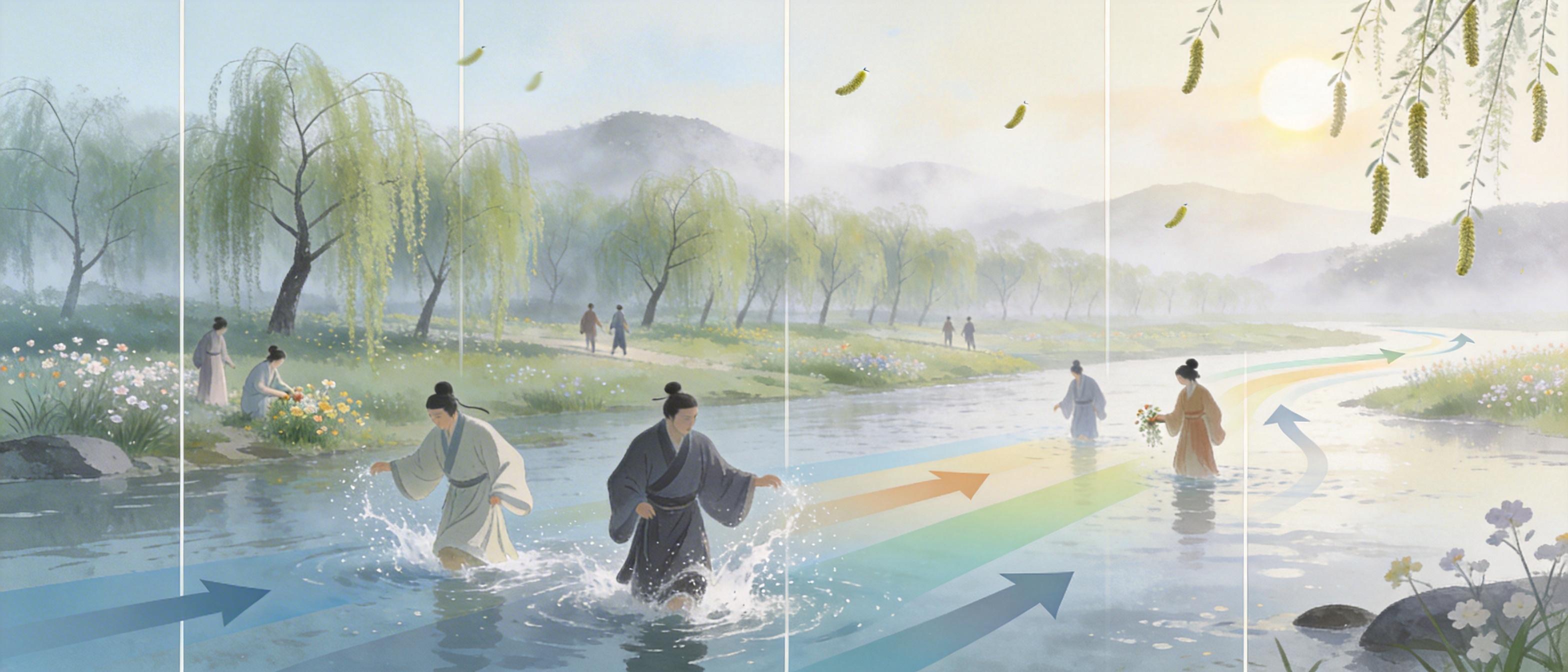 除了寒食节的祭扫,清明节的另一重底色——踏青春游,则来自上巳节。这个起源于春秋的节日,原本定在农历三月上旬的巳日,魏晋后固定为三月初三,核心习俗是在水边祓禊(洗浴净身)、招魂续魄,青年男女也会借此机会踏青嬉游。