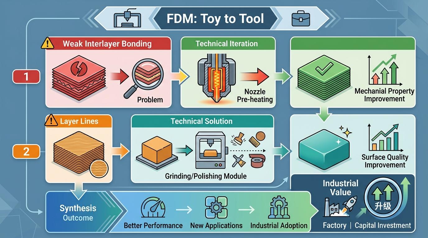 不过真实的技术迭代比这个类比更精确:为了弥补层间结合弱的问题,厂商开始给喷嘴加内置预热,能让层间力学性能提升21%以上;为了消除层纹,有的机型加入了自动打磨的后处理模块。这些技术改进,正是资本愿意下注的核心原因——FDM正在从“玩具”向实用工具升级。