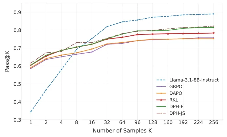 用反向KL的模型,Pass@1虽然上去了,但Pass@8比基础模型低了不少;而用DPH-RL的模型,不仅Pass@1是最高的,Pass@8还超过了没经过RL训练的基础模型——相当于AI既学会了“一次答对”,又没丢了“多想几种办法”的能力。