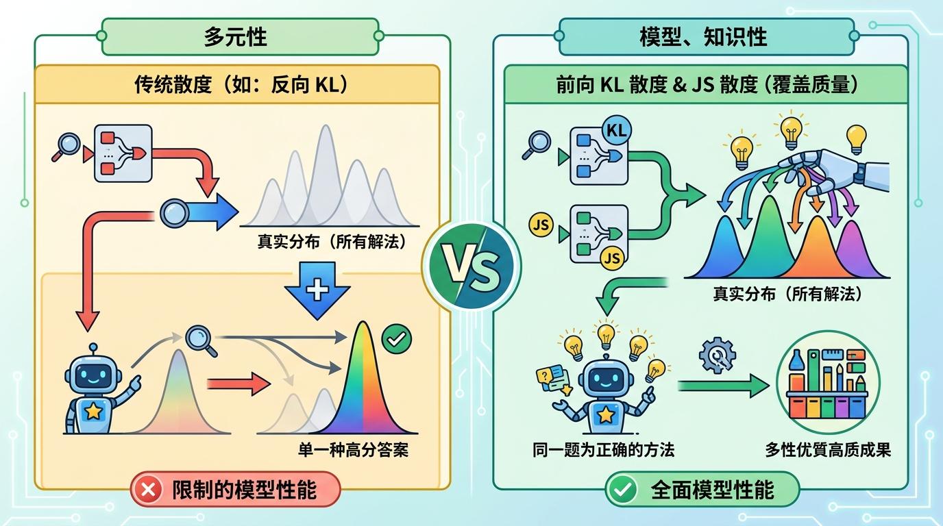 他们选择了前向KL散度和JS散度,这两种散度有个关键特性:“覆盖质量”。简单说,它们会逼着AI“复习”原本学过的所有解法,不能只盯着那一种高分答案。就像老师要求学生不仅要答对题,还要能说出所有可能的解题思路,不许偏科。