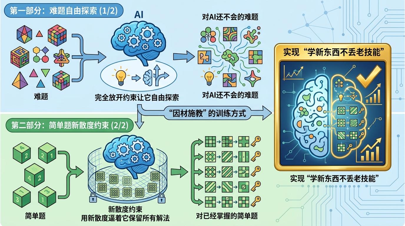 更聪明的是,他们把训练数据分成了两部分:对AI还不会的难题,完全放开约束让它自由探索;对已经掌握的简单题,就用新散度逼着它保留所有解法。这种“因材施教”的训练方式,终于实现了“学新东西不丢老技能”。