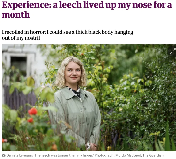 当24岁的背包客丹妮拉·利维拉尼在浴室的蒸汽中,感觉有什么东西从鼻腔深处滑落触碰到嘴唇时,她最初以为那只是一块摩托车事故后遗留的血凝块。然而,镜子里的景象却让她永生难忘:那并非死物,而是一条布满“脊状条纹”的活物。医院里,医生们花了半小时,才从她鼻腔内拽出一条近8厘米长的活水蛭。它已在她温暖、湿润、富含血液的鼻腔里,安然寄居了整整一个月。