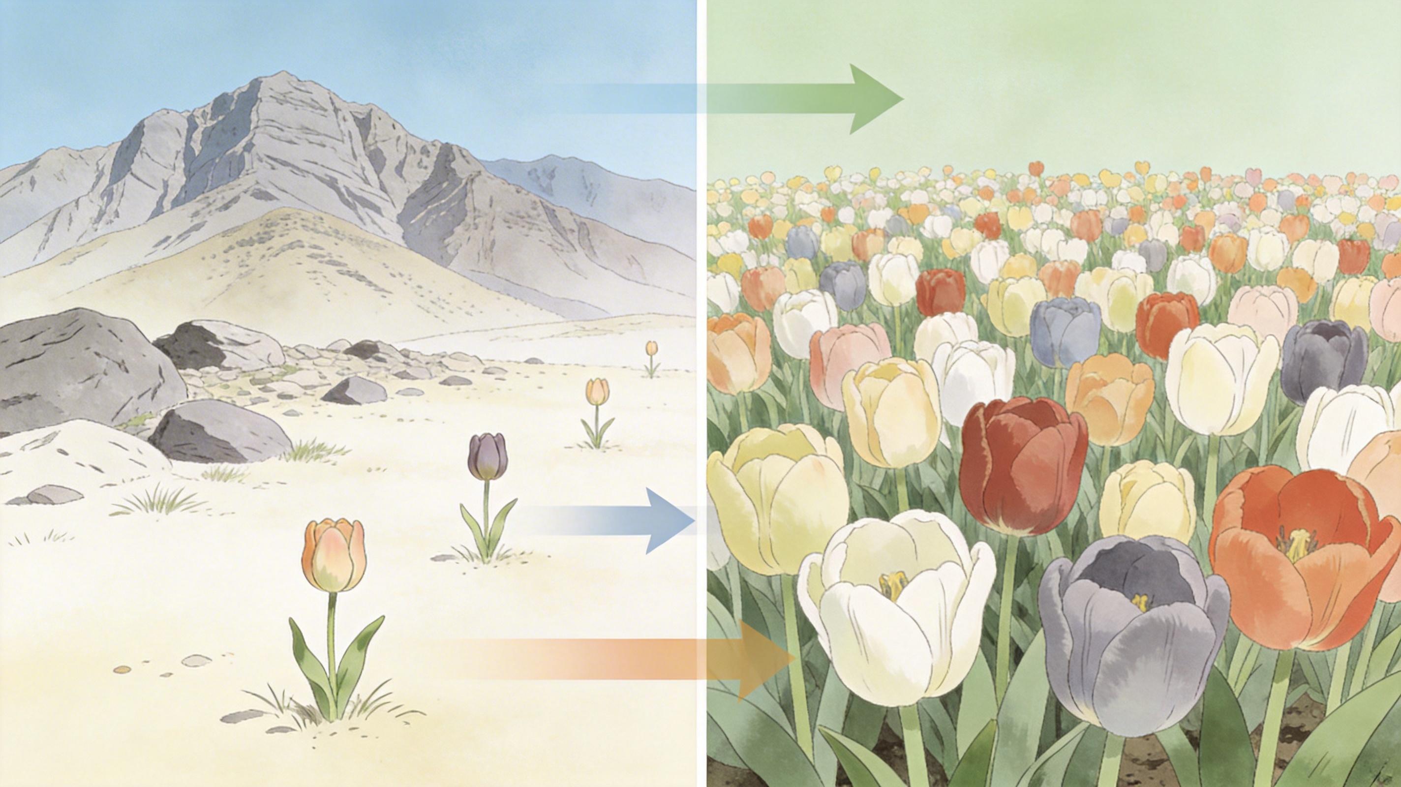 更现实的问题是,这些野生种群正面临生存危机。过度放牧、土地开垦和气候变化,让新疆野郁金香的栖息地不断缩小。它们不像荷兰的园艺品种那样能带来经济效益,却握着郁金香未来的钥匙——当全球变暖让荷兰的春化期越来越短,或许只有这些来自天山的基因,能让郁金香继续在春天绽放。