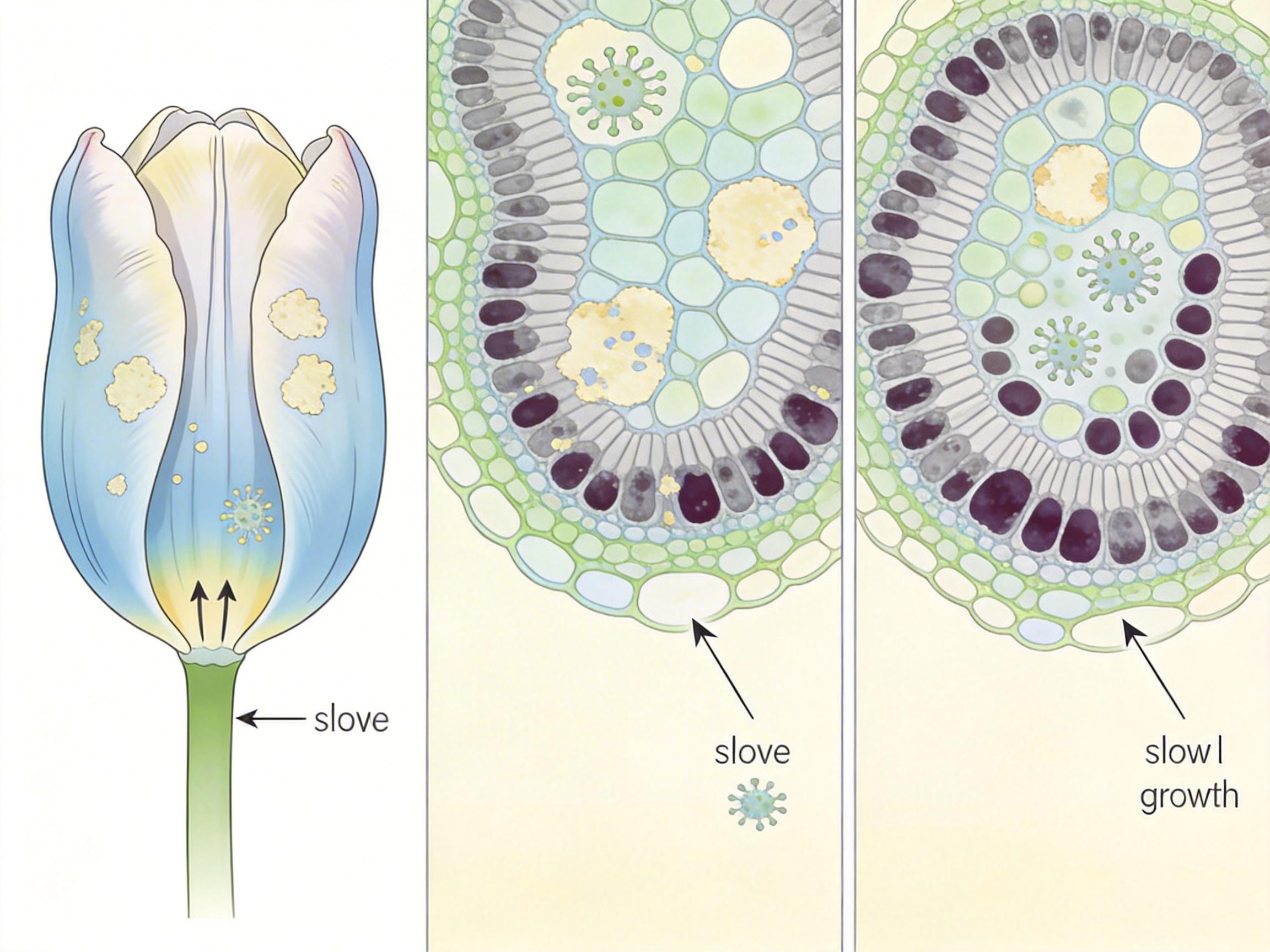 你可以把郁金香的花瓣想象成一块画布,花青素是天然颜料,原本该均匀铺满整个画面。但郁金香碎色病毒(TuBV)会偷偷篡改颜料的分配指令——它是一种靠蚜虫传播的单链RNA病毒,钻进花瓣细胞后,会精准抑制花青素的合成。