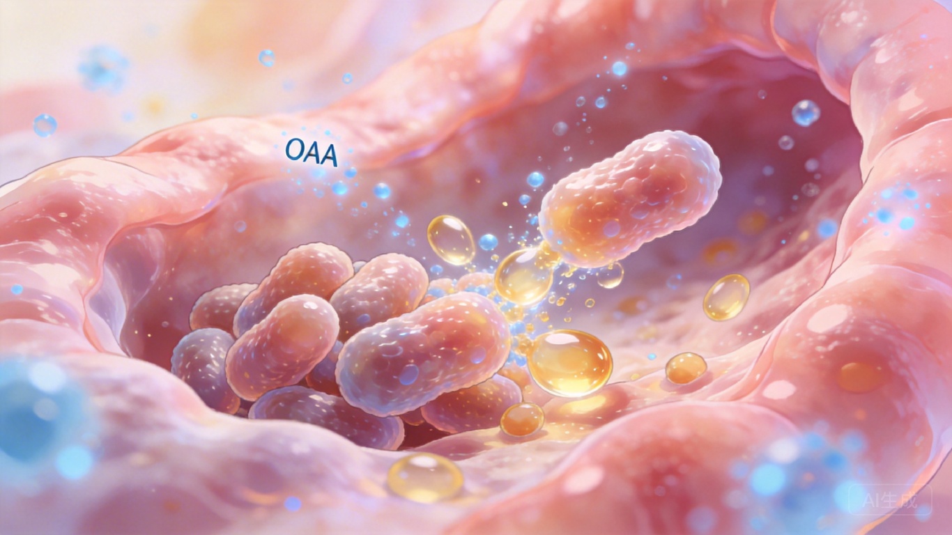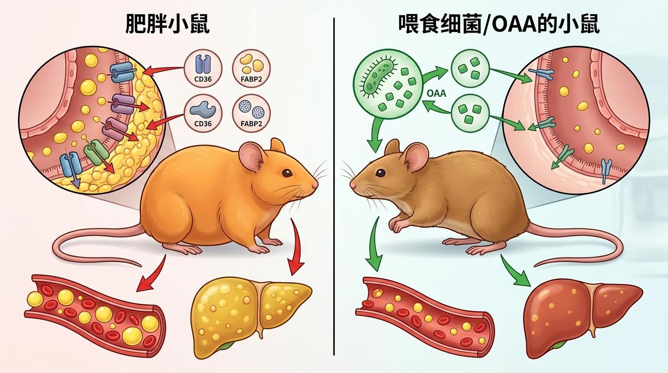 科学家先给肥胖小鼠喂了这种细菌,结果发现小鼠的肠道里,CD36和FABP2的含量明显降了,血液里的脂肪少了,连肝脏上的脂肪沉积也轻了。为了找到背后的关键,他们做了代谢组分析,最终锁定了OAA——这种细菌分泌的小分子,就是调节‘搬运工’数量的核心开关。