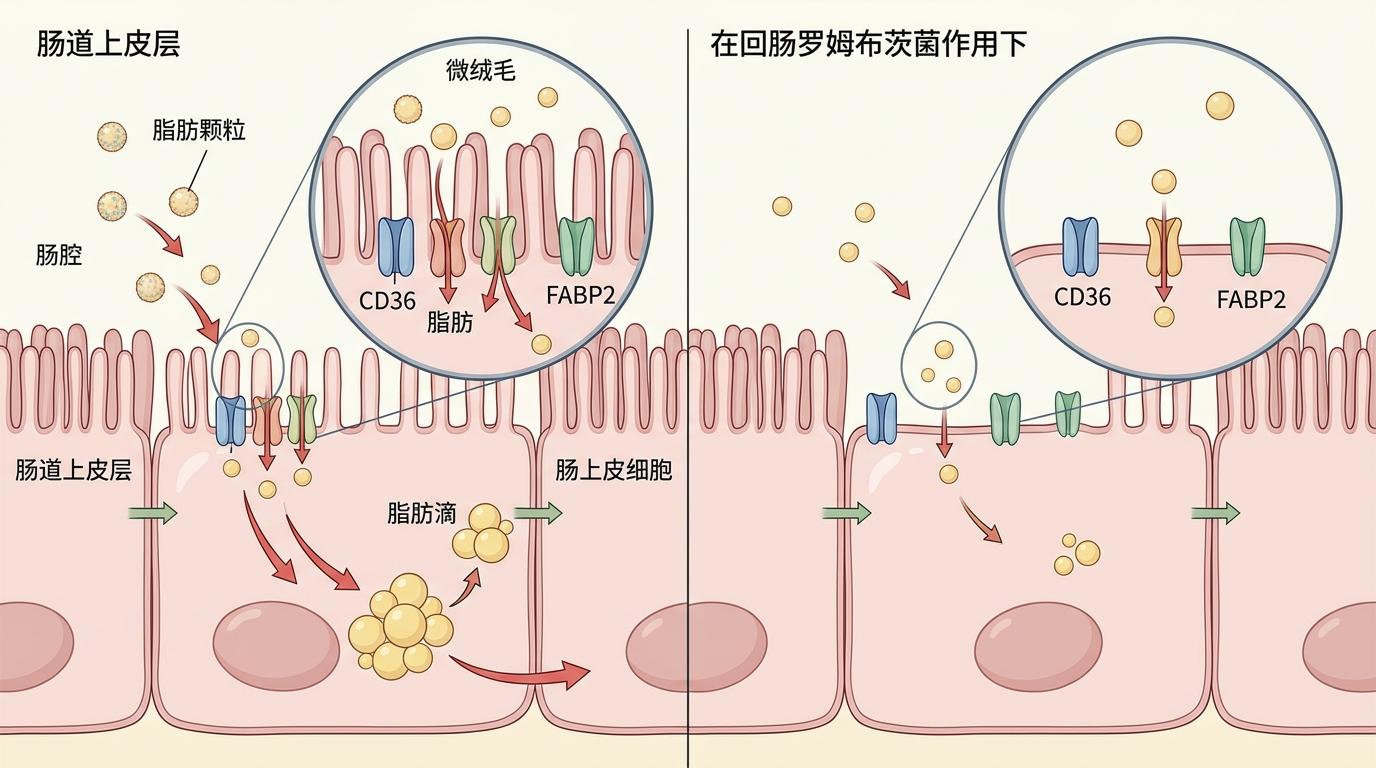 你可以把肠道想象成一条负责运货的传送带,脂肪就是那些要被运进身体的包裹,而CD36和FABP2就是传送带上的‘搬运工’——它们越多,脂肪被搬进去的速度就越快。回肠罗姆布茨菌的厉害之处,就是能让这些‘搬运工’变少。