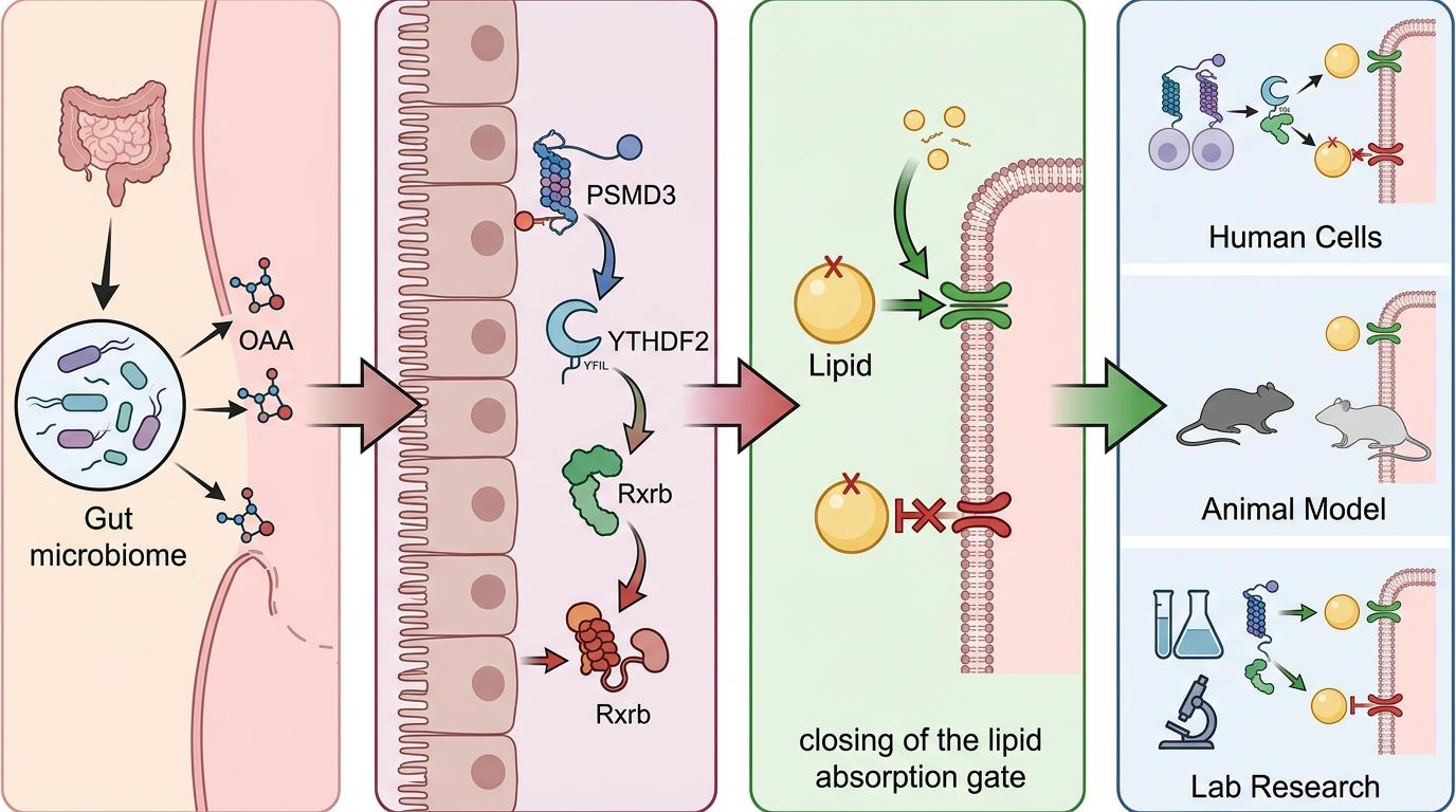 这条从回肠罗姆布茨菌到OAA,再到PSMD3、YTHDF2、Rxrb的信号链,就像一套精密的开关:细菌按动第一个按钮,后面的分子就跟着联动,最终关掉肠道吸收脂肪的‘闸门’。更重要的是,这套机制在人体细胞和动物模型里都得到了验证,不是实验室里的孤例。