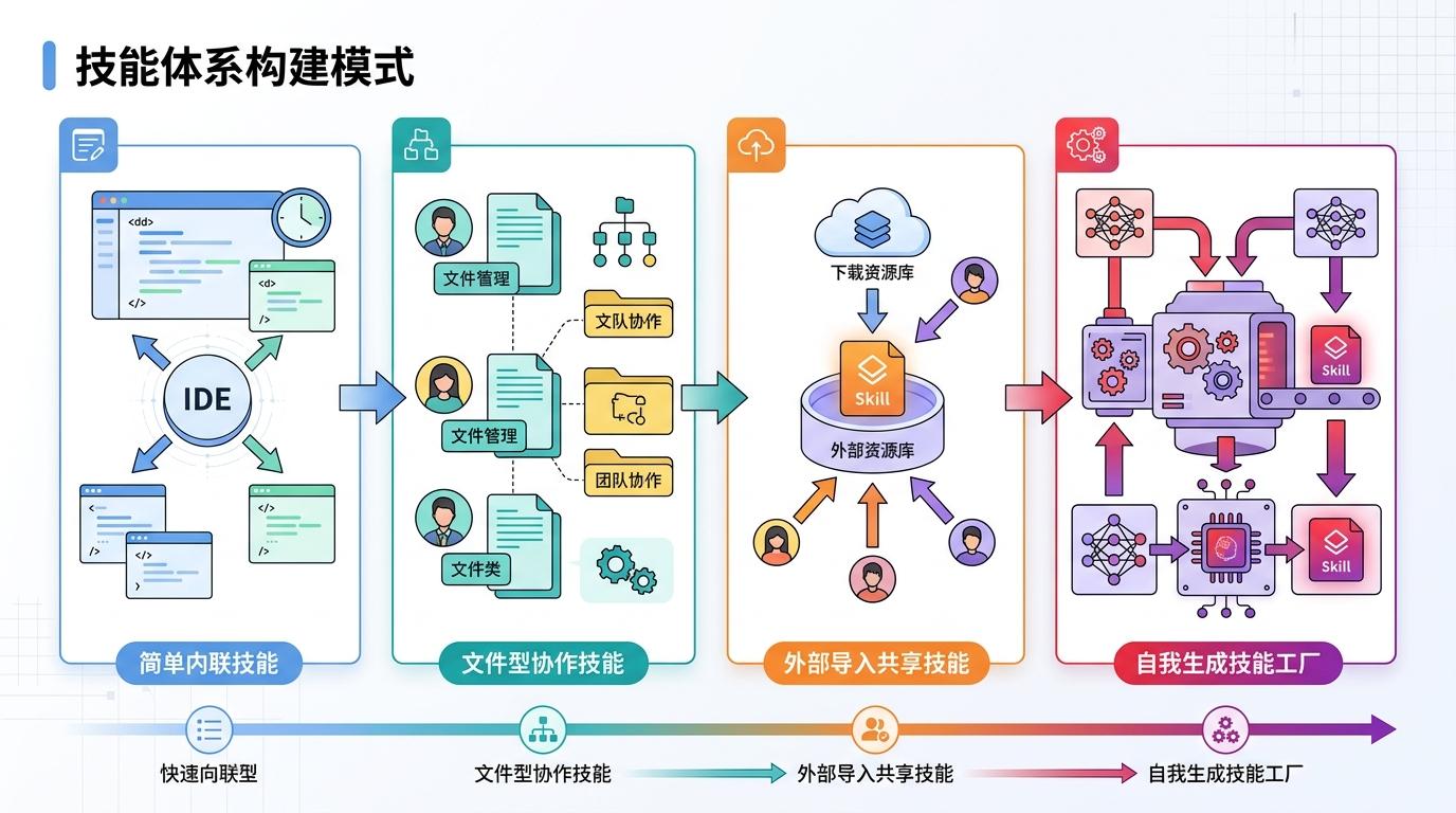 目前,这套技能体系已经形成了四种构建模式:从简单直接的内联技能,到便于协作的文件型技能,再到可以共享的外部导入技能,最终到能自我生成的Skill工厂。开发者可以根据需求灵活选择,比如先用内联技能快速原型,复杂技能再迁移到文件型,方便版本管理和团队协作。