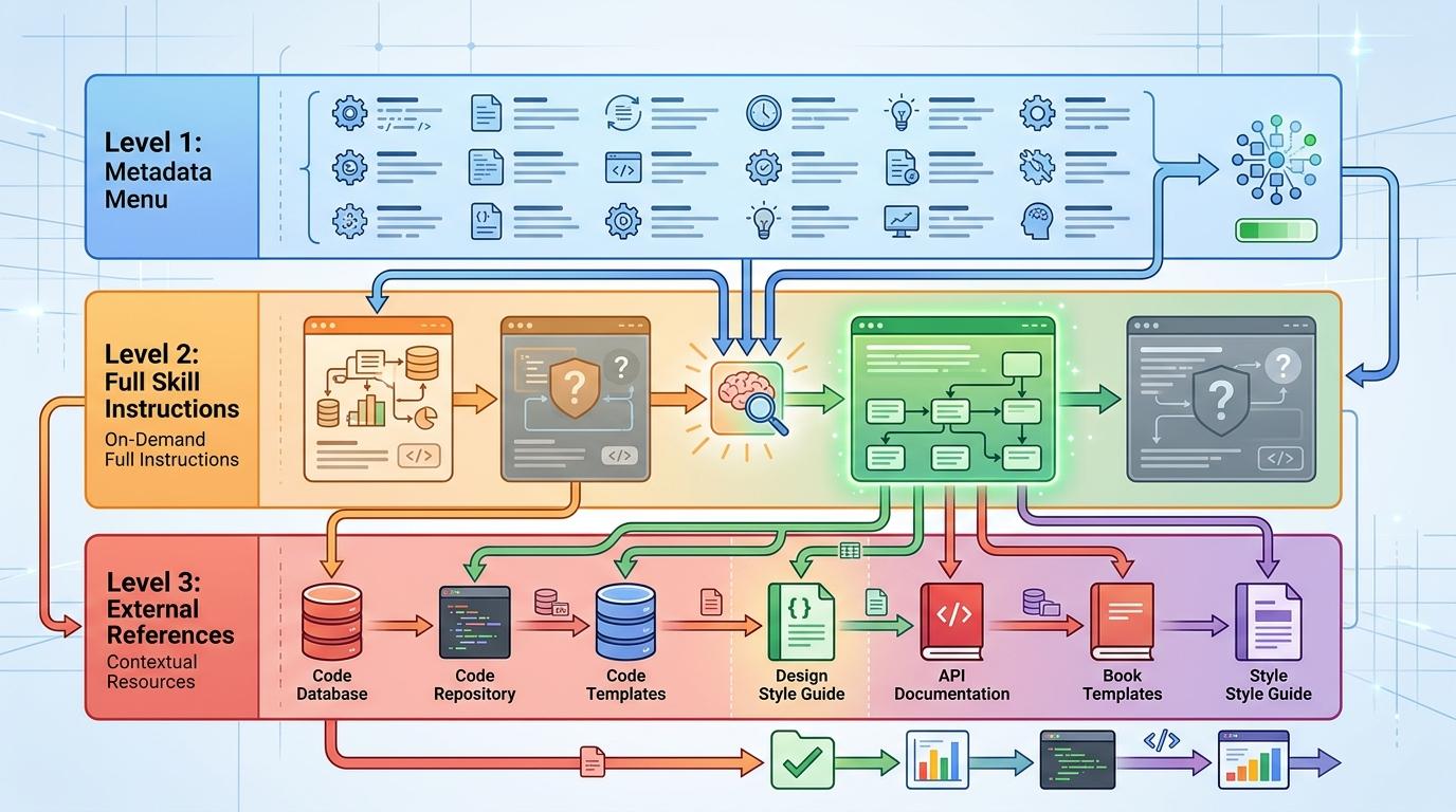 Google的解决方案是“渐进式披露”,把AI的技能拆成了三层:第一层是像菜单一样的元数据,只有技能名称和简短描述,启动时全部加载,总共只占约1000个token;第二层是完整的技能指令,只有当AI判断当前任务需要这项技能时才会加载;第三层是外部参考资料,比如代码模板或风格指南,执行时按需调取。