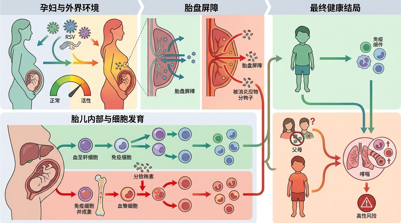 母体的免疫状态不只是被动传递营养,任何一次免疫激活——比如孕期的一场感冒、一次过敏发作,甚至长期的心理压力,都可能通过母胎免疫对话,影响孩子的免疫发育。 这就是所谓的母胎免疫激活(MIA):当母体免疫系统被感染或炎症激活,血液中的促炎细胞因子会穿过胎盘屏障,直接影响胎儿的造血干细胞和免疫细胞发育。比如孕期感染呼吸道合胞病毒,再加上父母本身有过敏史,孩子长大后得哮喘的风险会飙升——不是简单的叠加,而是两种因素协同作用,直接改变了肺部免疫细胞的发育轨迹。