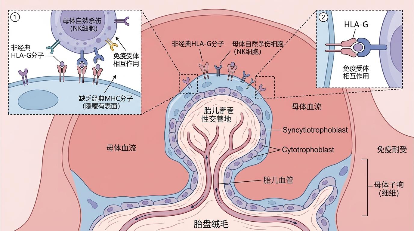 你可以把母胎界面想象成一个正在谈判的外交现场:胎儿带着半套“外来护照”,母体免疫系统则是警惕的边防部队。要避免冲突,双方得达成一套精准的和平规则。 首先出场的是胎盘——它不只是个营养输送站,更是个精明的“外交官”。胎儿的滋养层细胞会故意“藏”起能被母体免疫系统识别的经典MHC分子,转而亮出非经典的HLA-G分子,就像举着“我是自己人”的特殊通行证,让母体的自然杀伤细胞(NK细胞)放下攻击性。