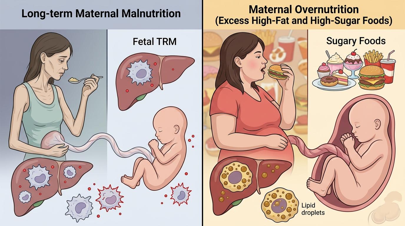当胎儿还在子宫里时,母体的营养状态就已经在给孩子的免疫系统“编程”了——这其中的关键角色,是一种叫组织驻留巨噬细胞(TRM)的免疫细胞。 你可以把TRM理解成胎儿体内的“长期观察员”:它们在胚胎发育早期就渗入各个组织,一辈子待在那里,既能清除病原体,也能调节局部免疫稳态。更重要的是,它们会像个记录员,把母体的营养状态编码成自己的“记忆”,并传递给后代。 比如,如果母体长期营养不良,胎儿的TRM就会朝着促炎的方向发育,一辈子都更容易处于炎症状态;如果母体营养过剩、摄入过多高脂高糖食物,TRM则会出现代谢紊乱,导致胎儿长大后得肥胖、糖尿病的风险飙升。