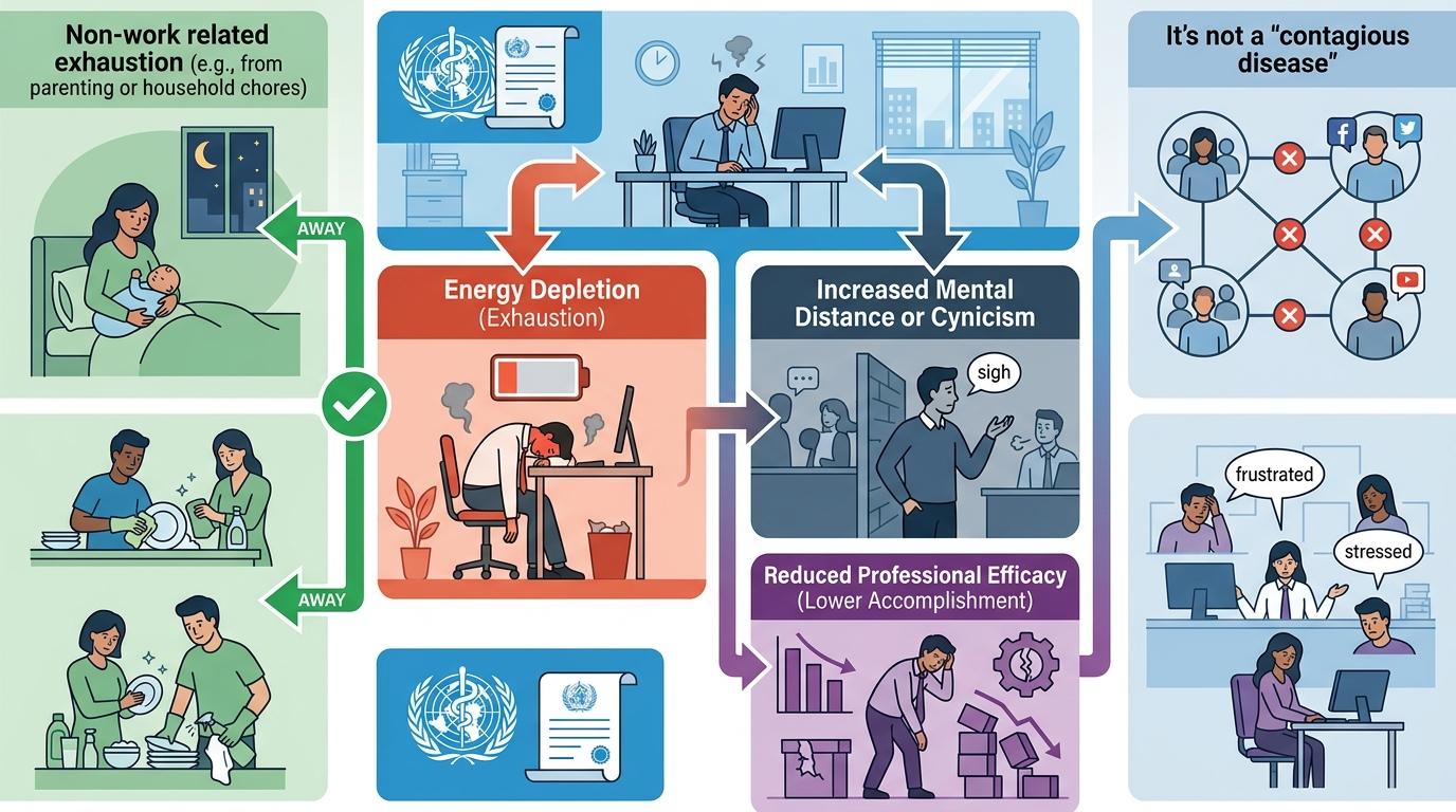 先得厘清一个最容易被混淆的定义:世界卫生组织明确过,职业倦怠是特指工作场景的综合征——它需要同时满足三个核心条件:持续的能量耗竭、对工作的心理疏离感、以及专业效能的明显下降。它不是给带娃熬夜、家务缠身的疲惫兜底的万能词,更不是一种会传染的“流行病”。但当“倦怠”成了社交平台上的高频标签,我们总忍不住把所有职场里的小崩溃都往里装,最后真的活成了“倦怠者”的样子。