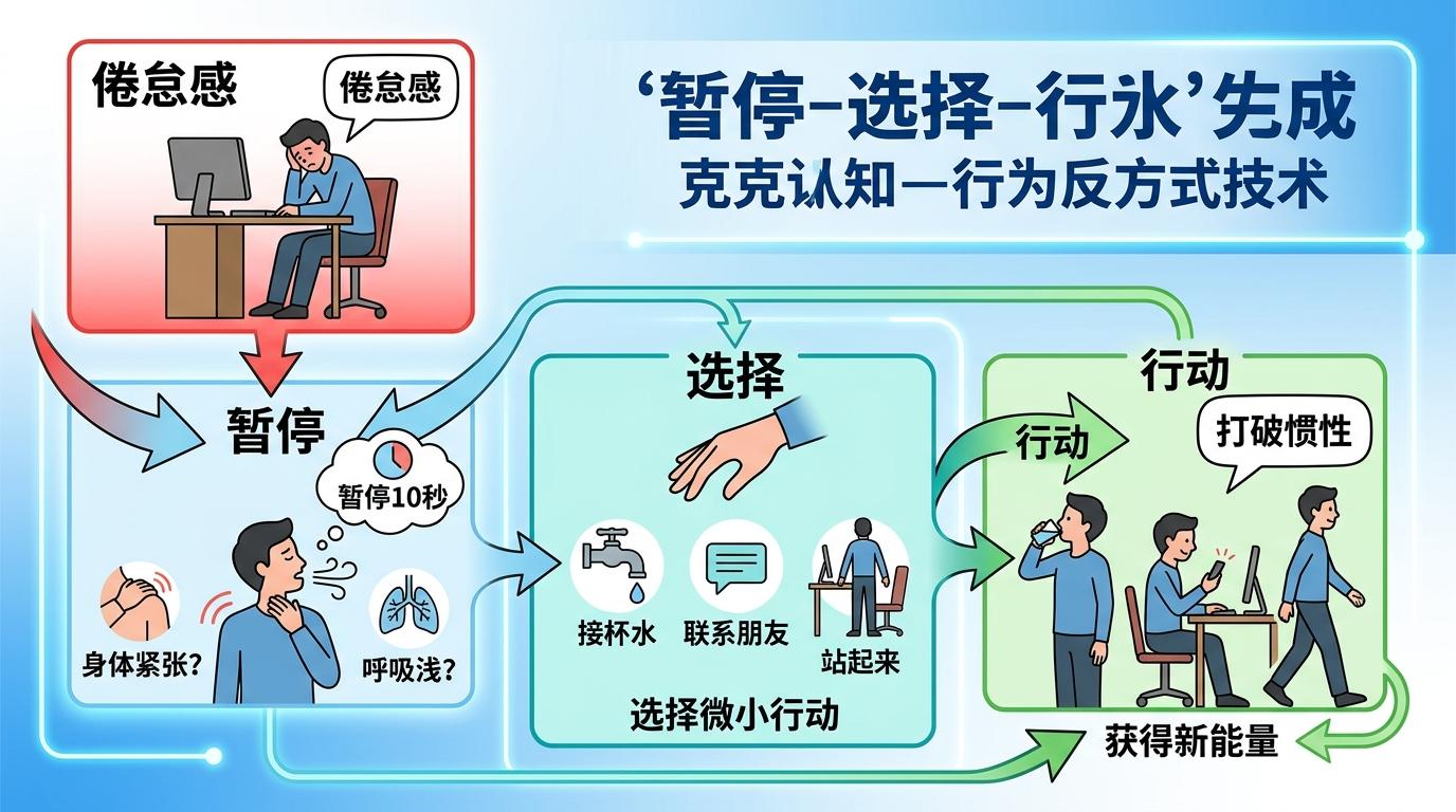 你可以试试那个被很多心理研究验证过的小策略:暂停-选择-行动。比如当你对着电脑发呆,觉得“倦怠又犯了”时,先暂停刷手机的动作,花十秒感受一下自己的身体——肩膀是不是绷着?呼吸是不是很浅?然后选一个最小的行动:站起来接杯水,或者给朋友发一句“我现在有点累”。就这么一个微小的动作,就能打破“我是倦怠者”的惯性思维。