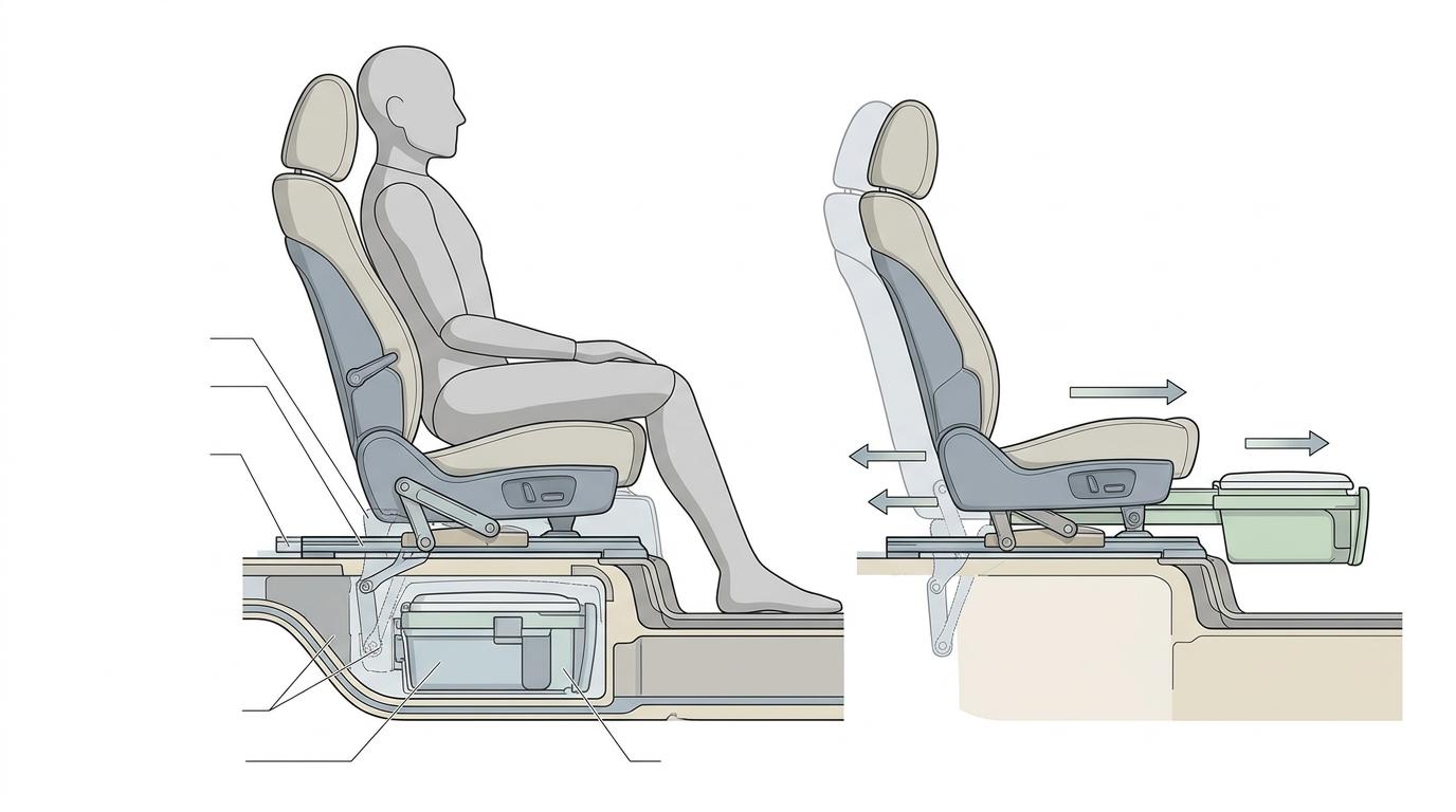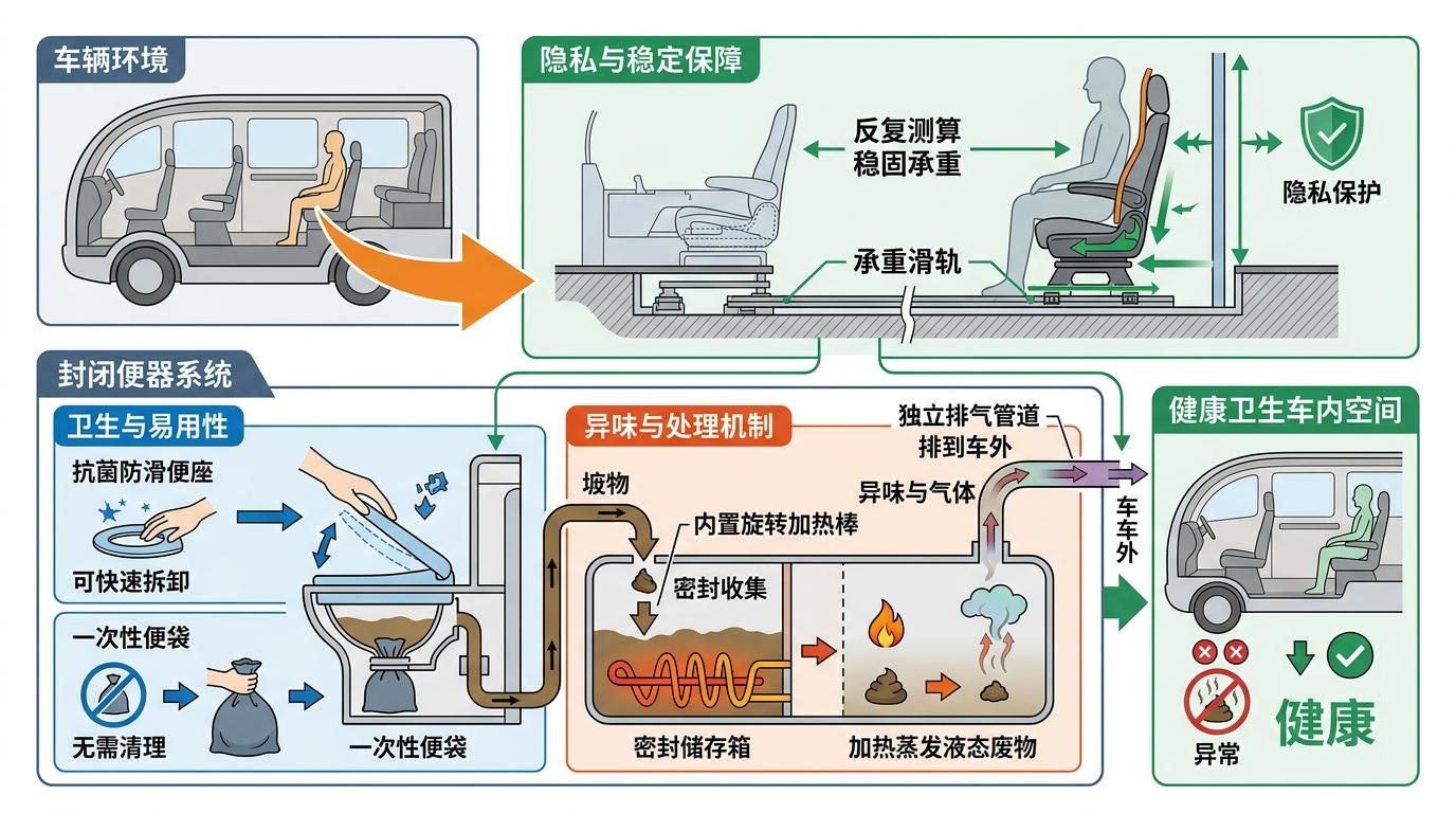 核心的技术难点从来不是“做一个能拉的地方”,而是如何在封闭车厢里解决异味、卫生和隐私问题。这套方案给便器配了密封储存箱,内置的旋转加热棒能把液态废物直接蒸发,再通过独立排气管道把异味排到车外;抗菌防滑的便座可以快速拆卸,一次性便袋的设计也省去了清理的麻烦。更关键的是,滑轨的承重能力经过了反复测算——它得同时托住使用者的重量和座椅的稳定性,哪怕在颠簸路面上也不能晃荡。
