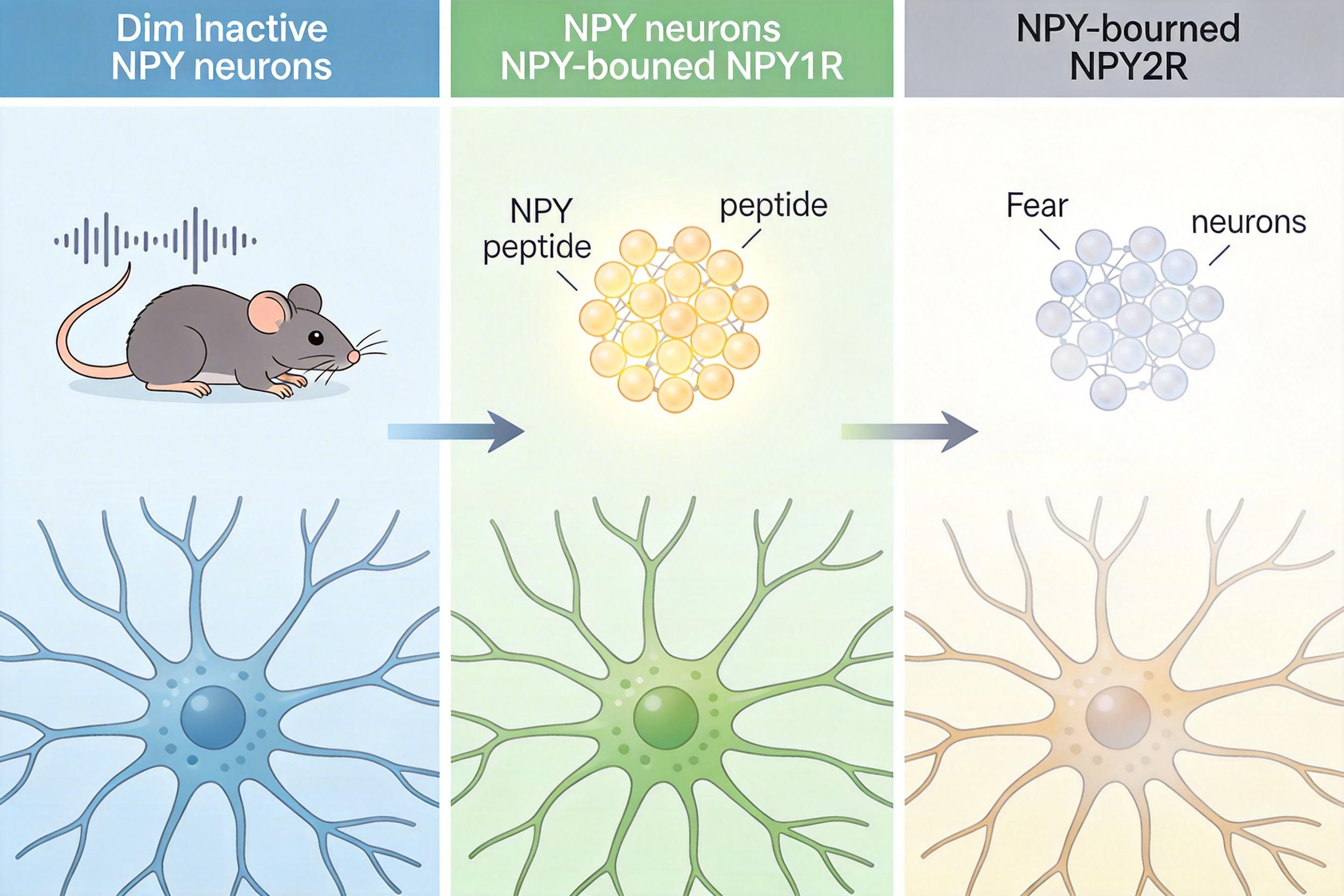 但真实的机制比这更精确:当小鼠反复听到提示音却没遭遇电击,也就是进入记忆消退阶段时,NPY⁺神经元的活动会逐渐增强,开始缓慢释放神经肽Y(NPY)。这不是简单的删除,而是启动了一套「分步解密」程序:早期快速消退阶段,NPY会找到表达NPY1R的神经元亚群,就像用一把快钥匙打开文件的外层锁;到了晚期缓慢巩固阶段,它又会切换到表达NPY2R的另一群神经元,用慢钥匙完成内层解密,让恐惧记忆彻底淡化。