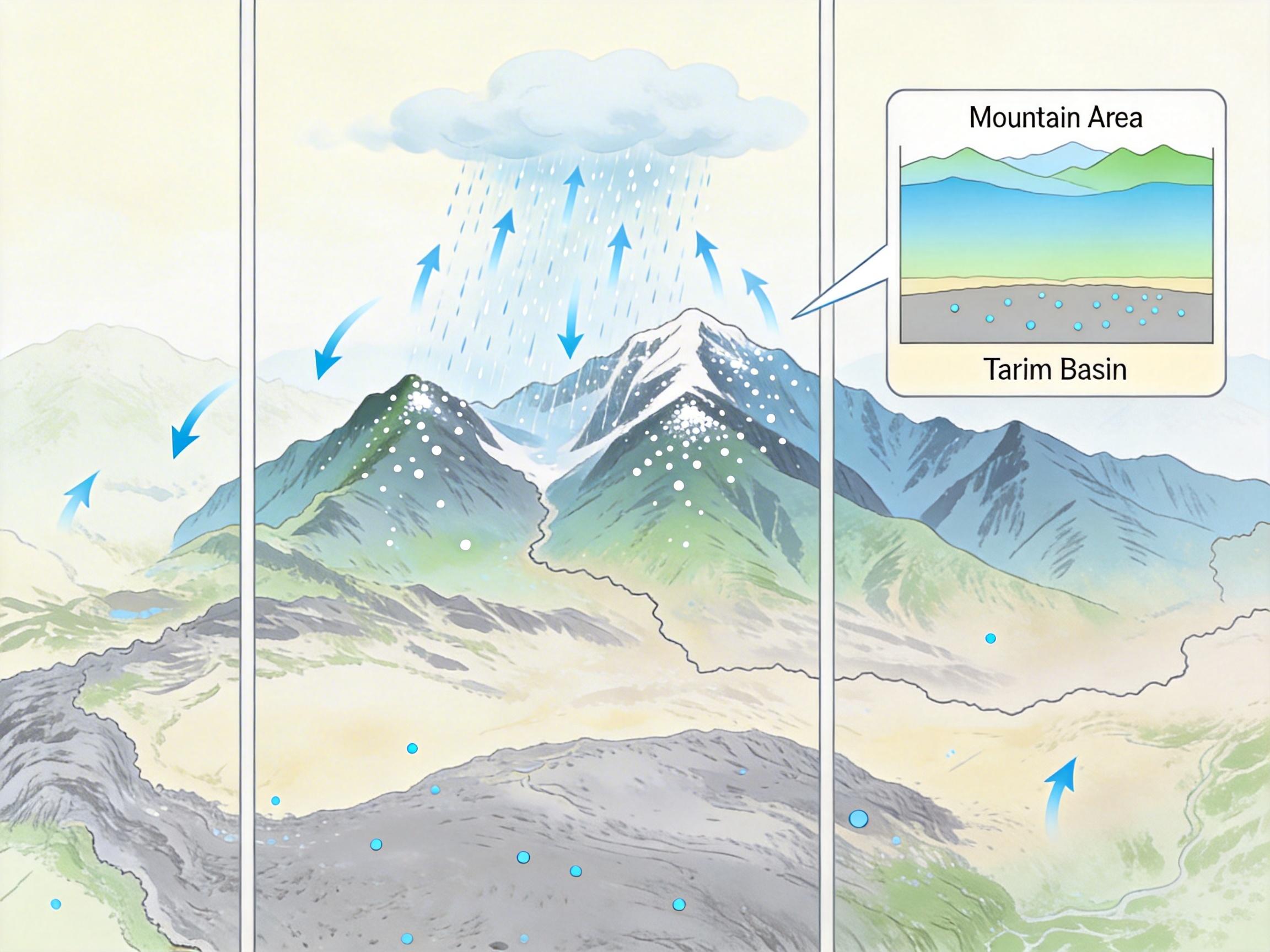 更关键的是,这些水汽并非全部飘走。约13%会在新疆本地完成“内循环”——天山、昆仑山的地形抬升让空气冷却,水汽凝结成雨雪落回地面,山地每年能截获50多毫米的再循环降水,而塔里木盆地这样的低洼区,有时连2毫米都不到。