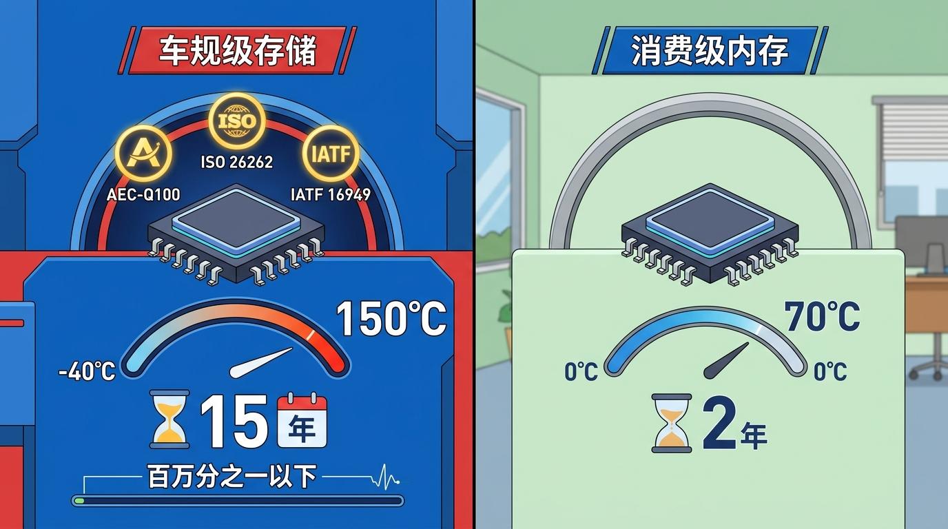 有人会问:华强北的内存条这么便宜,车企不能买来用吗?答案是真的不能——车规存储和消费级内存的差距,不是「手机和电脑」的区别,是「家用插座和工业配电箱」的区别。