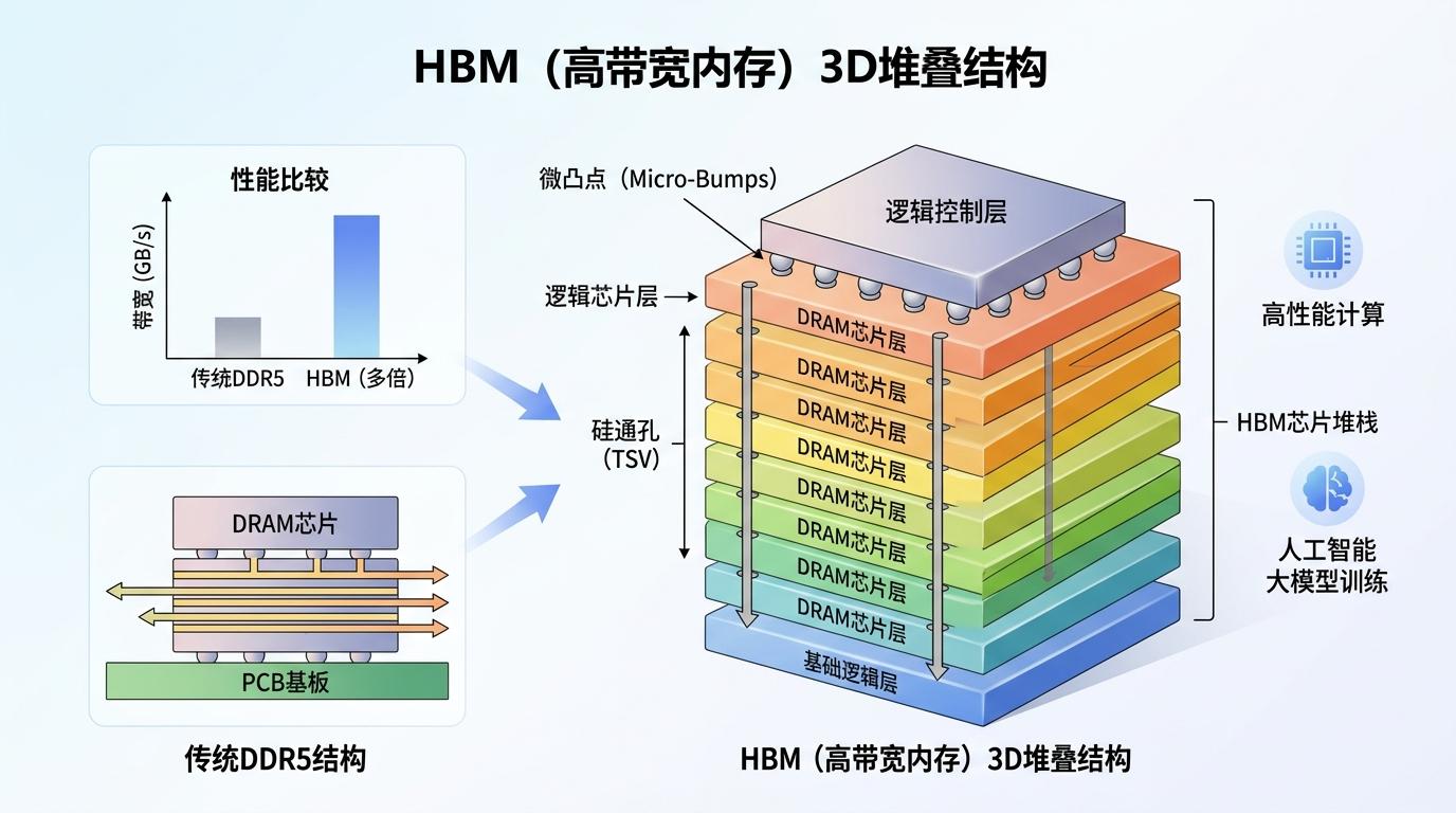 要理解这场分化,得先搞懂HBM(高带宽内存)——一种把多层DRAM芯片像叠蛋糕一样3D堆叠的技术,能让数据传输速度比普通DDR5快10倍以上。训练一个GPT-4级别的大模型,需要数万张GPU,每张都得配至少80GB HBM,而它的毛利率是普通DRAM的3-5倍。