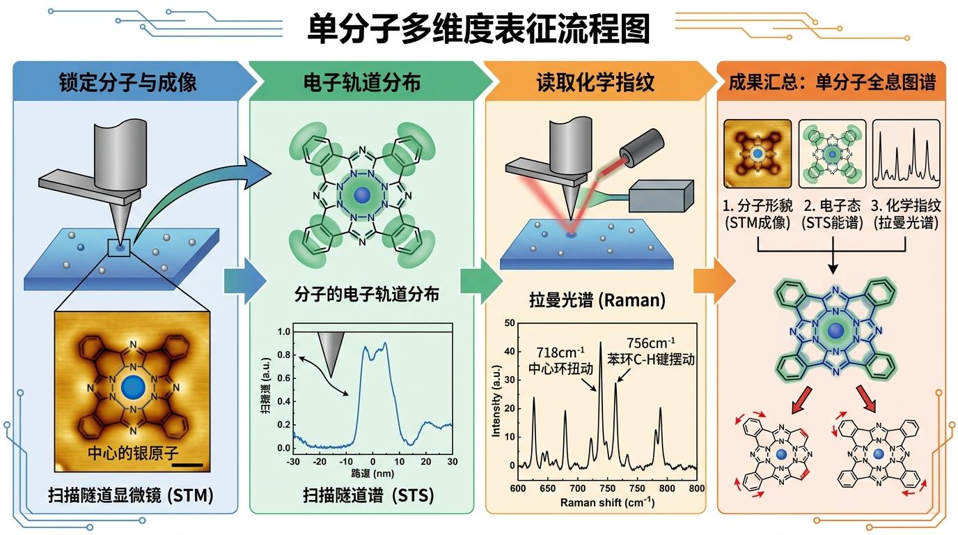 他们用单个银酞箐分子做了测试:先靠扫描隧道显微镜锁定分子位置,看清中心的银原子;再用扫描隧道谱画出分子的电子轨道分布;最后用拉曼光谱读出化学键的振动——718cm⁻¹的峰对应中心环扭动,756cm⁻¹的峰是苯环上C-H键的摆动,每一个细节都清晰可辨。这是第一次,科学家能在同一个系统里,完整拿到单个分子的形貌、电子态和化学指纹。