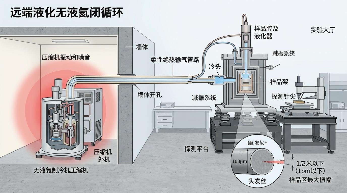 研究者用的是“远端液化无液氦闭循环”技术——你可以把它想象成给冰箱装了一根很长的柔性输水管,压缩机(冰箱外机)放在另一个房间,通过柔性管路把制冷后的氦气送到样品腔(冰箱内部)。这样一来,压缩机的振动完全传不到探测平台,样品区的振动幅度被压到了1皮米以下——相当于把一根头发丝的直径再分成100万份。