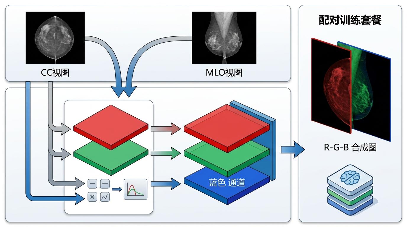 你可以把这个思路理解成给AI准备「配对训练套餐」:把原本分开的两张灰度钼靶图,塞进一张RGB彩色图的三个通道里——红色通道放CC视图,绿色通道放MLO视图,最关键的蓝色通道,放的是两张图的像素级绝对差值。