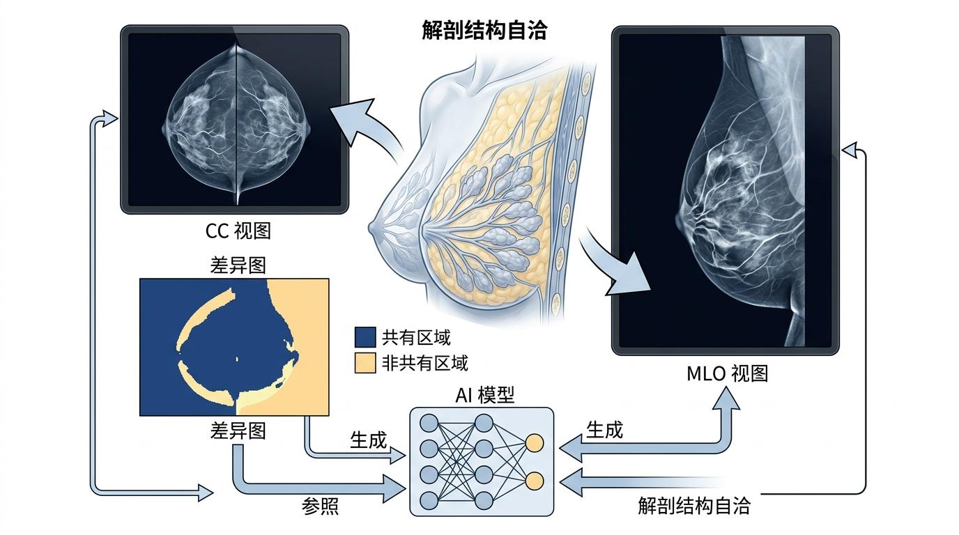 乳腺钼靶筛查必须同时看两个角度的片子——从上往下拍的头尾位(CC)和从侧面斜拍的内外斜位(MLO),两个视图互补才能揪出藏在软组织里的病变。但公开数据集中,近半数病例的双视图是残缺的,要么只有CC,要么只有MLO。没有成对的数据,AI根本学不会「用两个视角看同一个乳房」。