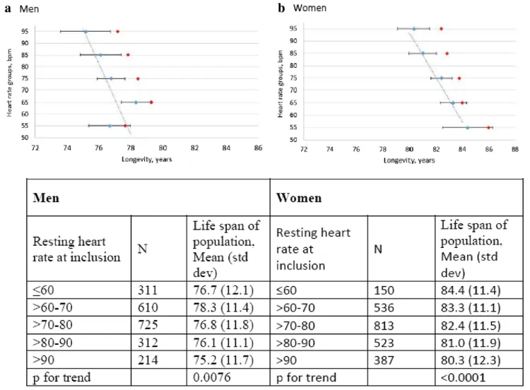 研究数据显示,心率越快,生命的时钟似乎也走得越快。在法国队列中,5年内静息心率每分钟增加10次,死亡风险便随之攀升20%。在美国队列中,这一趋势在男女两性中同样得到验证:男性8年内心率每分钟增加10次,死亡风险增加13%;女性则增加9%。