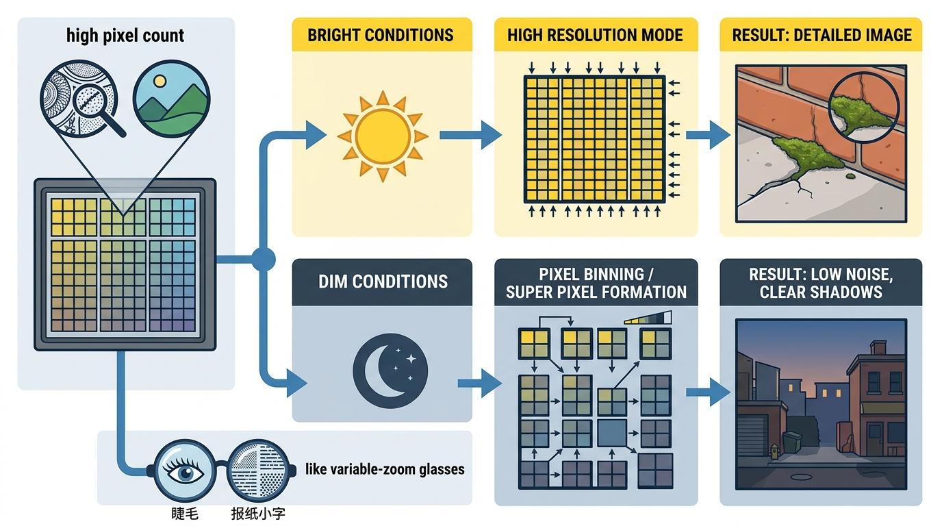 它的解决办法,是给传感器装上了「双增益开关」。当光线充足时,高像素模式全开,每一个小像素都负责捕捉细节,放大后连墙缝里的苔藓都清晰;当光线变暗,传感器会自动把四个小像素合并成一个「超级像素」,相当于瞬间拥有了大像素的进光量,噪点被压下去,暗部的纹理自然就浮了上来。这就像相机自带了一副可变焦的眼镜,远看能数清睫毛,近看也能看清报纸小字。