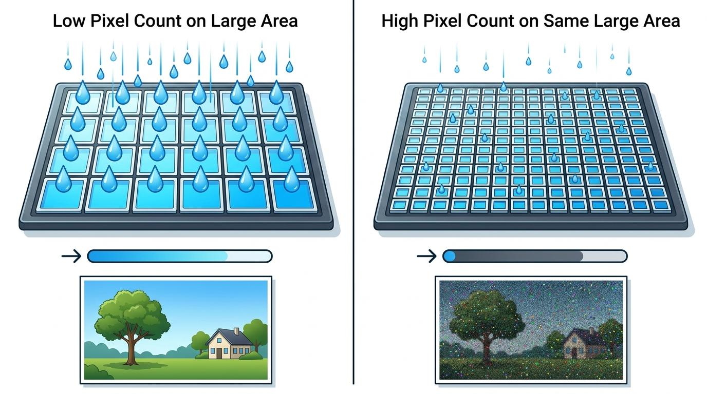 大底传感器的优势早不是秘密:尺寸越大,能接住的光子就越多,就像用大桶接水,比小杯子更能攒住光线。但这款设备的传感器尺寸没升级,像素却从940万跳到了3700万——这在以前几乎是「自杀式升级」,毕竟挤在同样大的传感器上,单个像素会变小,接收到的光子更少,噪点会像雪花一样糊满屏幕。