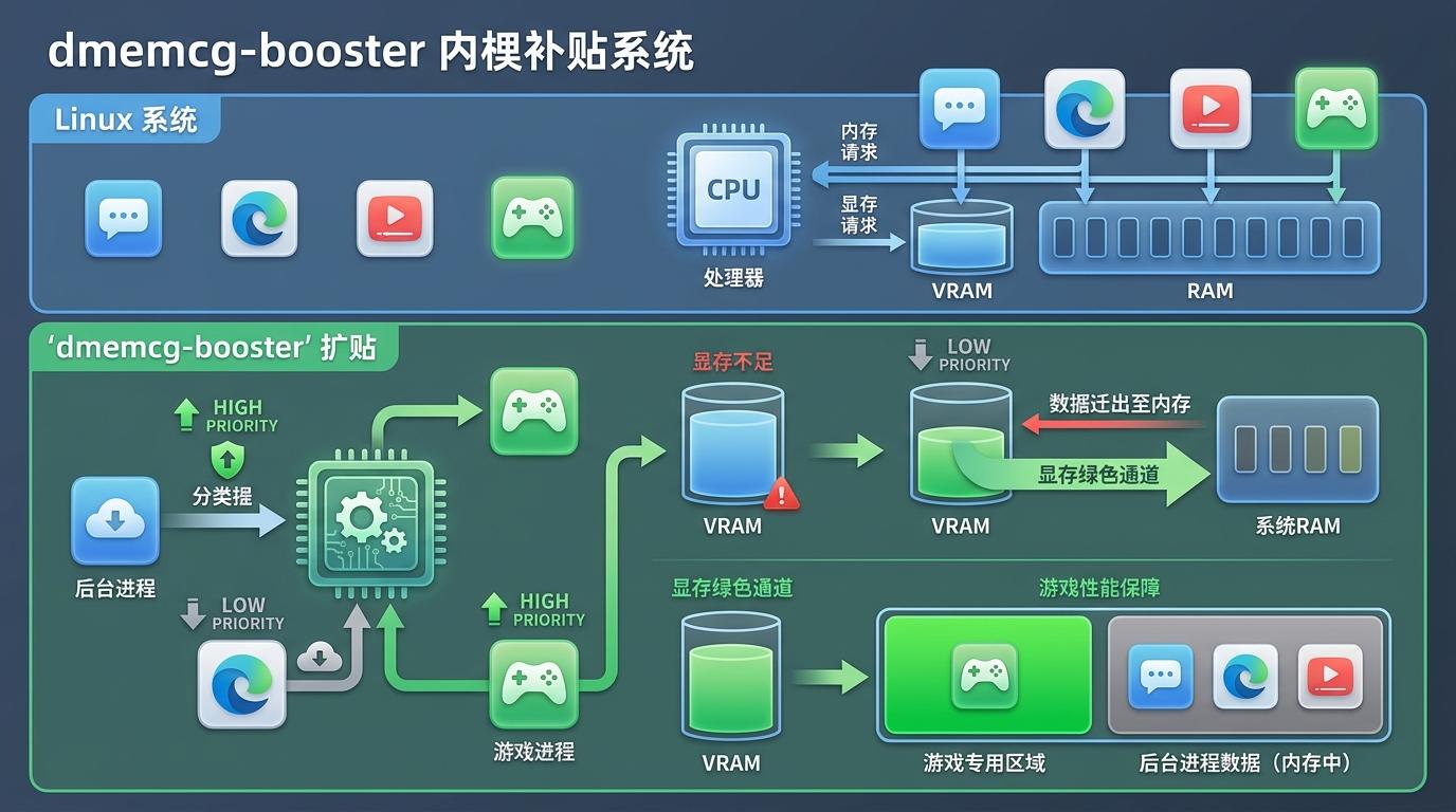 这套被叫做dmemcg-booster的内核补丁,本质是给游戏开了「显存绿色通道」。它基于Linux的cgroups机制,给不同进程贴上「优先级标签」:当显存不足时,系统会先把后台程序的数据挪去内存,优先保证游戏的「快速储物柜」不被占用。