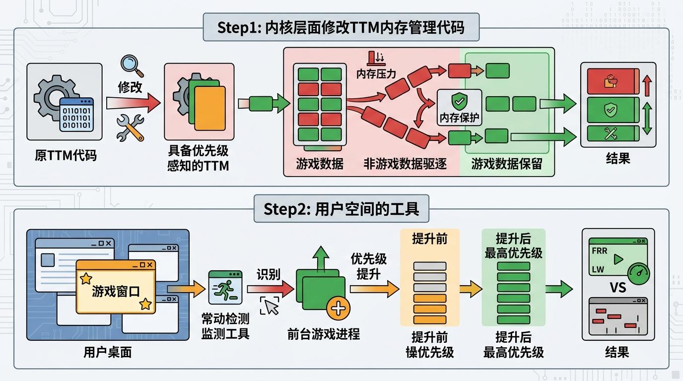 具体操作分两步:首先是内核层面修改TTM内存管理代码,让系统能识别进程优先级,避免游戏数据被随意驱逐;其次是用户空间的工具,实时监测前台窗口,自动把游戏进程的优先级拉满。