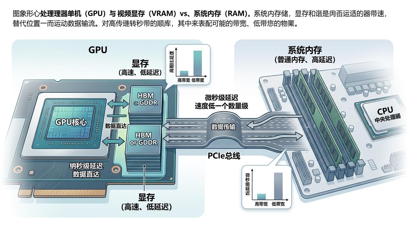 你可以把显存想象成GPU专属的「快速储物柜」:游戏需要的纹理、模型数据都存在这里,GPU伸手就能拿到,延迟只有几纳秒。系统内存则是楼下的「普通仓库」,取一次数据要经过PCIe总线这个「收费站」,速度慢了整整一个数量级。