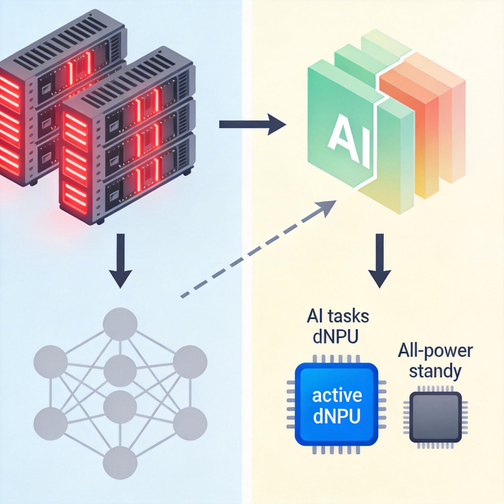 过去要让大模型本地跑,只能堆高性能GPU,就像给整个办公室都配顶配电脑,不仅贵,还费电。而端侧异构架构的思路是:让合适的人干合适的活。把热激活参数放在专门为大模型优化的dNPU(专用神经网络处理单元)里,这部分芯片去掉了图形渲染等无关功能,只专注高速处理AI任务;冷激活参数则交给功耗更低的通用SoC(系统级芯片),平时处于低功耗待机,只有需要时才启动。