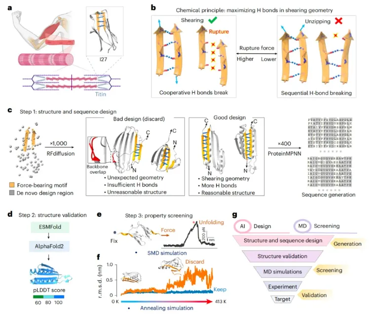 通过这个“AI生成-物理筛选”的闭环,研究团队将蛋白质中起关键稳定作用的氢键数量,从天然的4个,精准地、系统性地增加到了33个。实验证明,蛋白质的机械强度与氢键数量呈现出完美的线性关系——氢键越多,蛋白质就越“坚不可摧”。这不仅是对一个化学原理的验证,更是对一种全新设计哲学——数据驱动与物理定律相结合——的成功实践。
