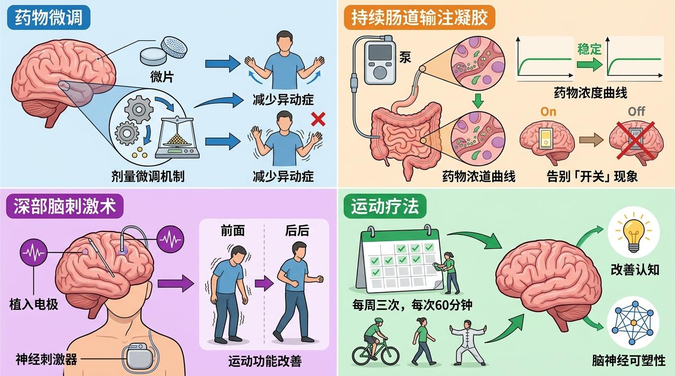 更值得关注的是,帕金森的治疗早已不是只靠吃药。左旋多巴依然是控制运动症状的核心,但新型微片能实现5毫克级的剂量微调,减少异动症的发作;持续肠道输注凝胶能让药物浓度更稳定,告别「开关」现象的折磨。对于药物效果不佳的患者,深部脑刺激术能通过植入电极调节神经活动,中期手术的患者运动功能能改善近五成。而运动疗法的作用被严重低估了——每周三次、每次60分钟的综合锻炼,能显著改善认知功能,甚至促进脑神经可塑性。