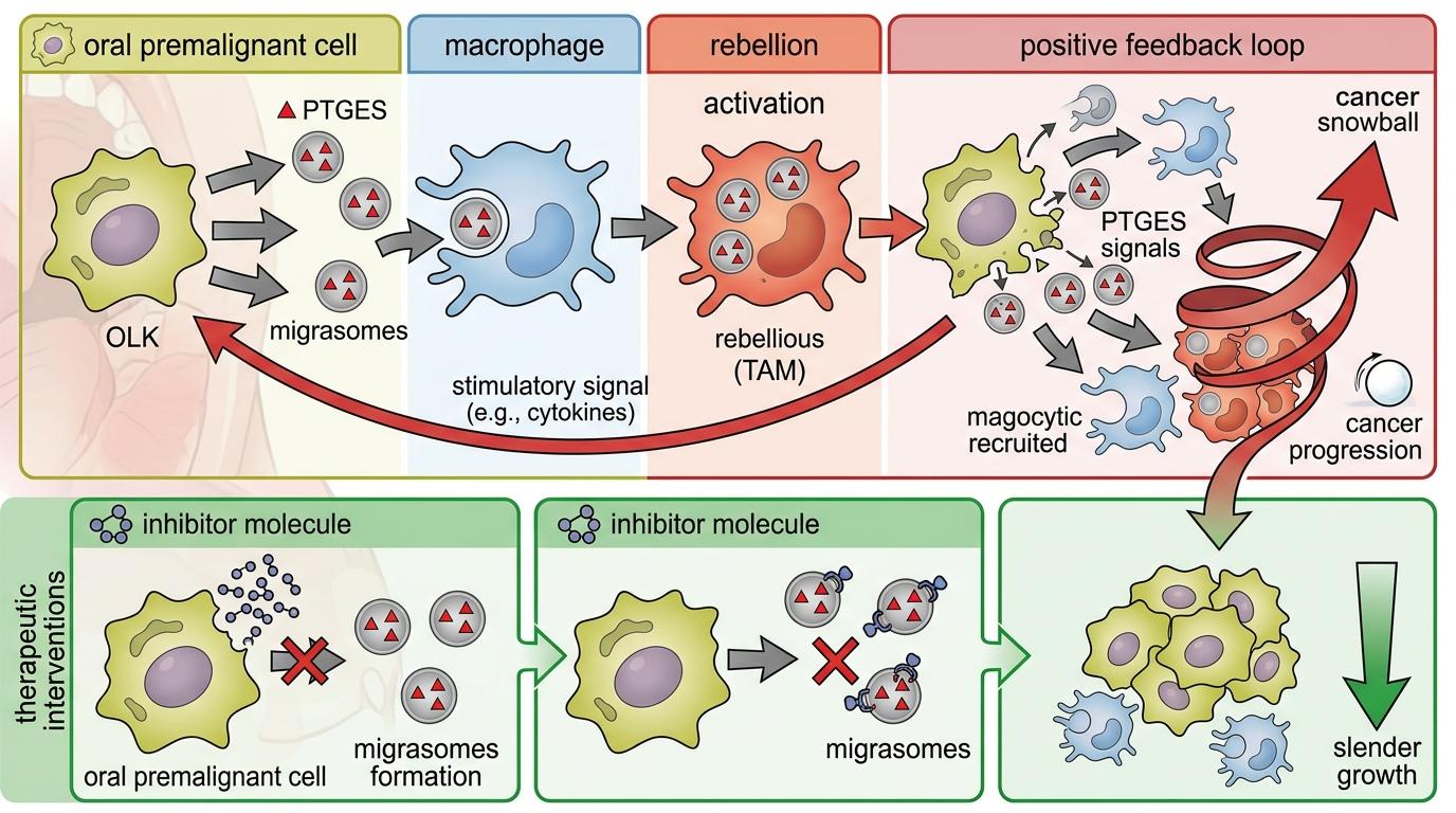 更可怕的是,这是一个正反馈循环:叛变的巨噬细胞会进一步刺激癌细胞释放更多携带PTGES的迁移体,吸引更多巨噬细胞加入“叛军”,让癌变的雪球越滚越大。团队通过实验证实,只要阻断迁移体的形成,或者抑制PTGES的活性,就能显著减缓口腔白斑的癌变速度。
