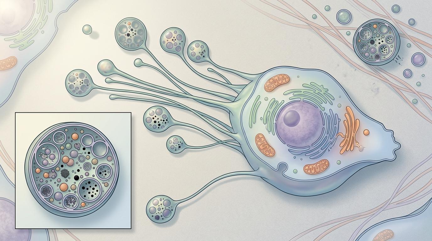 你可以把迁移体想象成细胞在“搬家”时留下的快递包裹——当细胞移动时,会在身后拉出细长的“回缩纤维”,这些纤维末端会鼓起形成石榴状的小泡,就是迁移体(migrasomes)。它直径只有0.5到3微米,比头发丝细几十倍,却能装满蛋白质、核酸等信号分子,脱离细胞后就成了在组织间游走的“信使”。