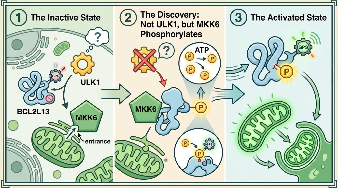 但真实的机制比这更精确:BCL2L13的GPS功能不是一直全开的,它需要被磷酸化——就像给GPS充上电。过去科学家以为是ULK1激酶干这个活,直到这次研究发现,真正给它充电的,是守在“发电站门口”的MKK6。