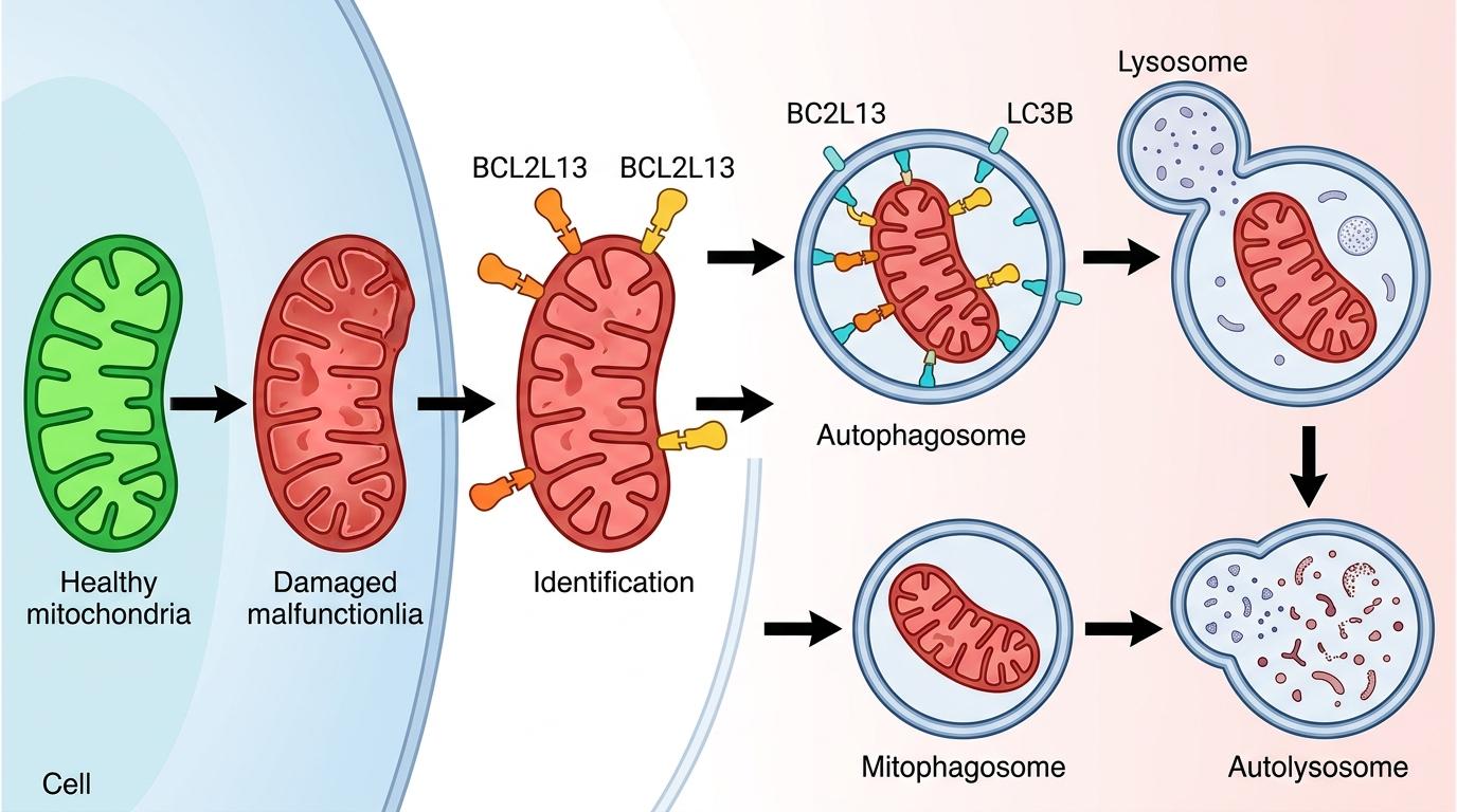 为了收拾这些坏发电站,细胞进化出了“线粒体自噬”机制:相当于给自噬体这个“垃圾车”装个GPS,精准定位故障线粒体,把它打包运去溶酶体“垃圾站”销毁。而BCL2L13就是这个GPS,它能一头粘在线粒体上,一头勾住自噬体的LC3B蛋白,让垃圾车精准上门。