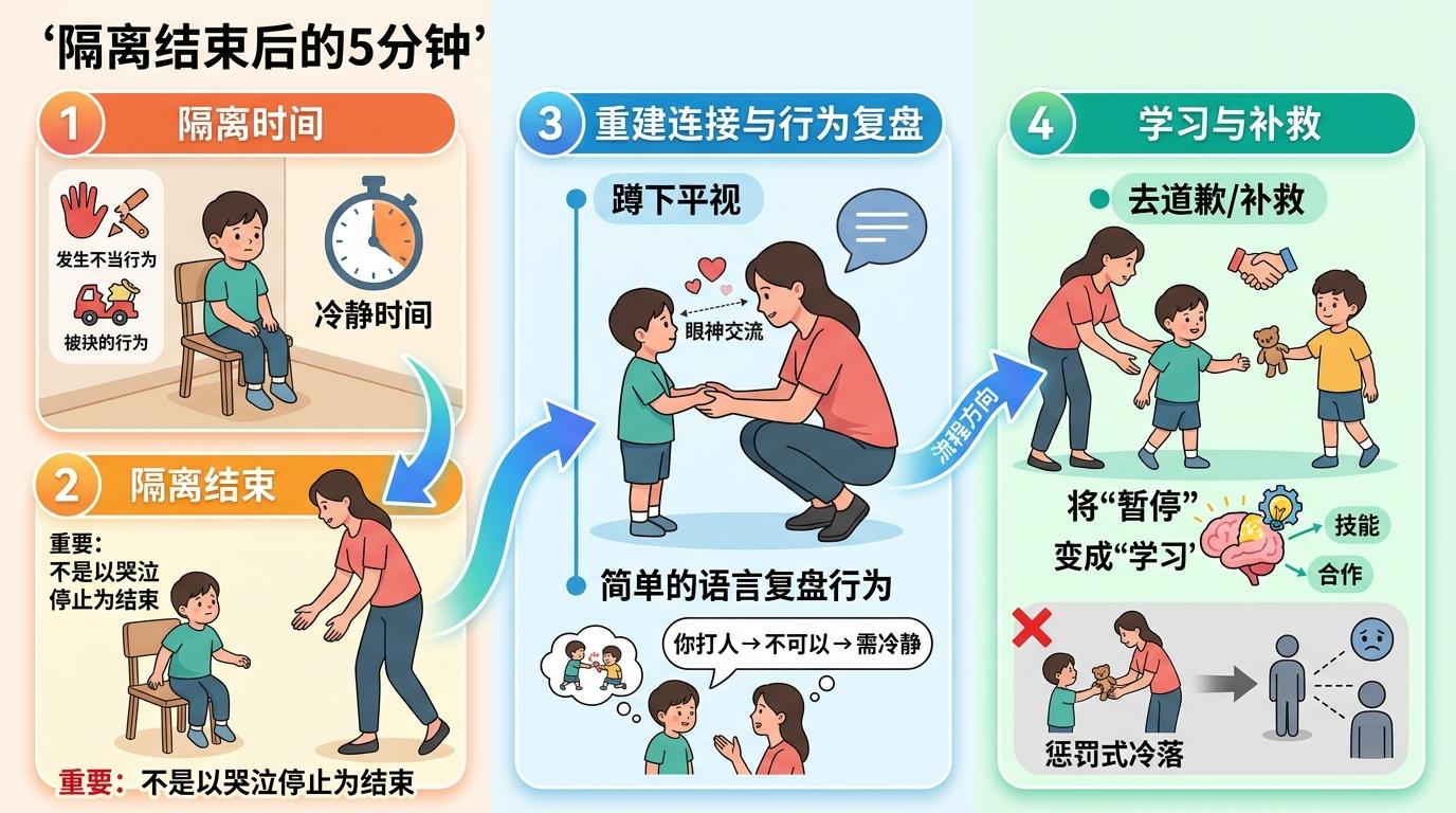 最容易被忽略的,是隔离结束后的那5分钟。真正有效的时间隔离,从来不是以孩子哭够为终点,而是要在他们冷静后立刻重建连接——蹲下来和他们平视,用简单的语言复盘行为:“你刚才打了小朋友,所以需要冷静,现在我们去和他说对不起好不好?”这才是把“暂停”变成“学习”的关键,也是它和惩罚式冷落的本质区别。