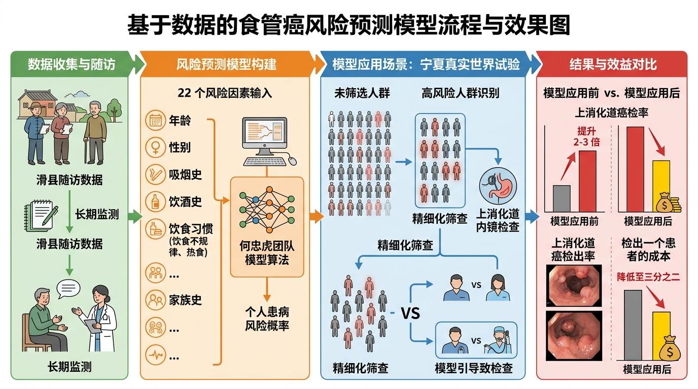 他们没有停留在“筛查有效”这个结论上。基于滑县的随访数据,何忠虎团队建起了食管癌风险预测模型:把年龄、性别、吸烟喝酒史、饮食习惯等22个因素放进模型,就能算出一个人患食管癌的风险。在宁夏的真实世界试验里,这个模型让上消化道癌的检出率翻了2到3倍,检出一个患者的成本降到了原来的三分之二。