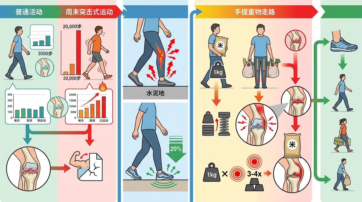 比步数更伤膝的,是那些被忽略的走路细节。平时每天只走3000步,周末突然暴走2万步,这种「突击式运动」就像反复弯折一张薄纸,软骨会在短时间内被磨得千疮百孔;水泥地配薄底鞋走路,硬地面的反冲力直接撞在关节上,换成缓冲运动鞋能减少20%的膝关节压力;更别说手提重物走路——每多1公斤负重,膝盖要承受3到4倍的压力,相当于把一袋大米直接压在关节上。