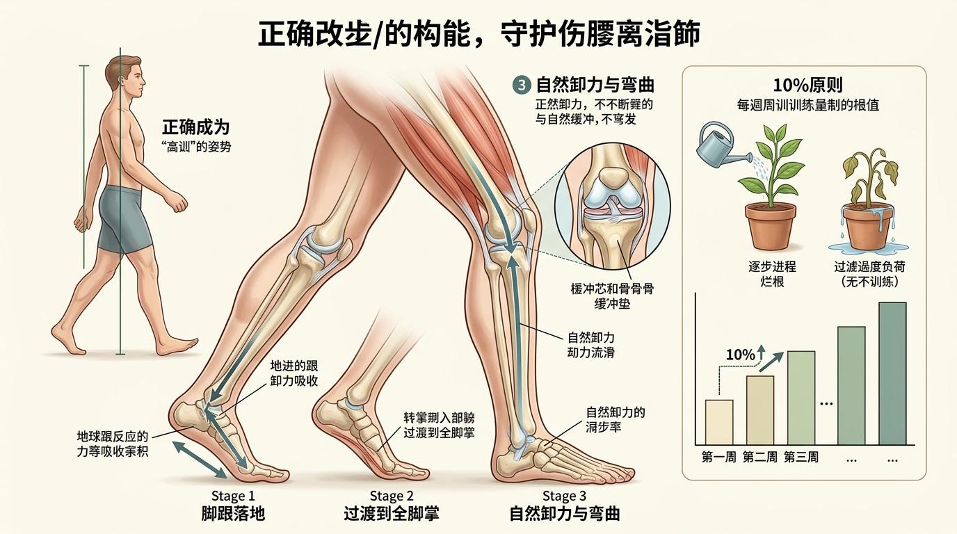 正确的走路姿势,是给膝盖装一层「缓冲垫」。想象头顶有根线向上提着,腰背挺直,肩膀放松,脚跟先落地再过渡到全脚掌,别把膝盖完全锁死,让关节在迈步时自然卸力。更要记住「10%原则」——每周步数增幅别超过上周的10%,给身体足够的适应时间,就像给植物浇水,一次浇太多只会烂根。