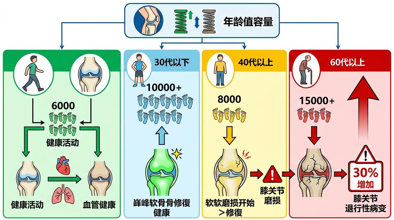 真正的科学建议,从来不是一刀切的数字。《中国居民膳食指南》明确,成年人每天6000步中等强度活动就够了,而膝盖的承受力,会像老化的弹簧一样随年龄衰退。30岁以下的年轻人,膝关节软骨修复力处于巅峰,一万步只是日常运动量;可到了40岁,软骨磨损速度开始超过修复速度,8000步就是需要警惕的上限;60岁以上的老人,6000步左右才是稳妥的选择——北京协和医院的研究早已证实,长期日行超1.5万步的中老年人,膝关节退行性病变风险会增加30%。