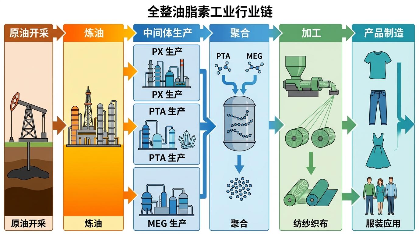 你可以把聚酯产业链想象成一条从油田到衣柜的“能量传送带”——上游是埋在地下的石油,经过炼油厂变成石脑油,再加工成对二甲苯(PX),接着氧化提纯为PTA,和另一种石化原料MEG聚合,就成了聚酯颗粒。这些颗粒被纺成纤维、织成面料,最后缝成你身上的T恤、牛仔裤和连衣裙。
