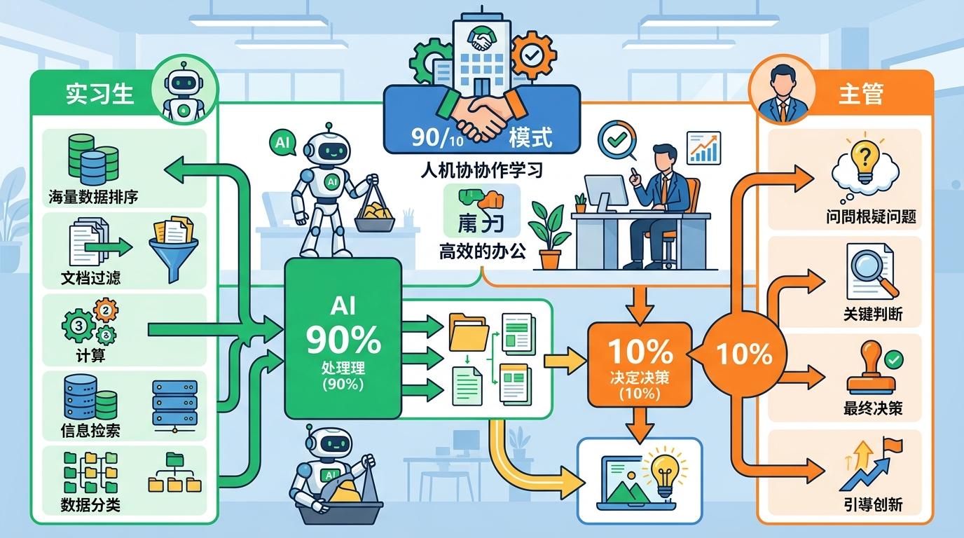 你可以把人机协同学习想象成一场高效的办公室分工:AI是负责整理文件、筛选资料的实习生,包揽90%重复、机械的信息处理工作;而人类是掌握决策权的主管,专注剩下10%的提问、判断和最终拍板。这就是教育创业者李可佳提出的“90/10模型”——AI承担记忆、计算、信息搬运等低阶任务,把人类的认知资源彻底解放出来,聚焦那些机器学不会的事。