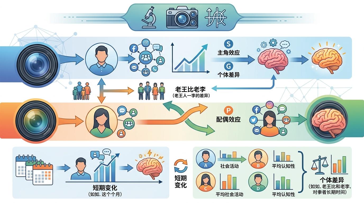为了精准区分这些社交对夫妻双方的影响,研究者用了「多水平模型」这个统计工具。你可以把它想象成一个能同时放大两个镜头的相机:一个镜头对准自己的社交和自己的认知(主角效应),另一个镜头对准伴侣的社交和你的认知(配偶效应),还能区分「老王比老李社交多所以脑子好」的个体差异,和「老王这个月麻将打多了脑子变灵光」的短期变化。