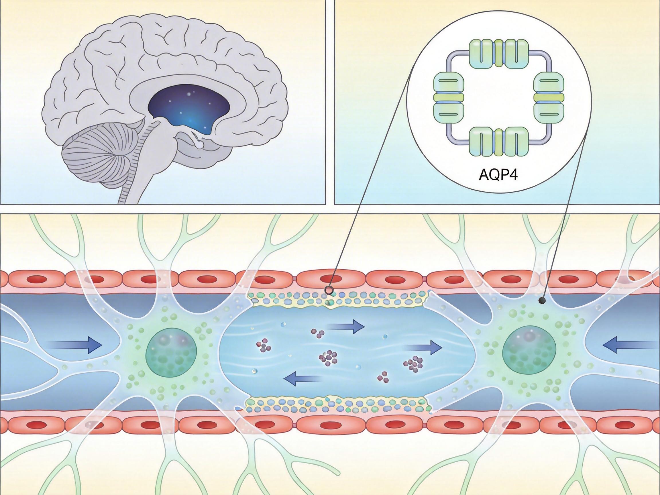 你可以把脑淋巴系统想象成大脑里的一套地下排污管网——星形胶质细胞伸出的「管道」沿着血管壁铺开,依靠水通道蛋白AQP4像水泵一样驱动脑脊液流动,把代谢废物、错误折叠的蛋白质顺着血管间隙「冲」出大脑。这套系统在深度慢波睡眠时效率最高,相当于夜间启动了大脑的全面大扫除。